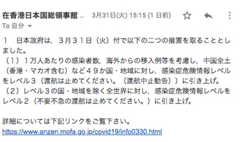 暫くブログをお休みしている間に、 どんどん、どんどん、どんどん、どんどん状況は変わり 2020年3月31日の外務省の感染症危険情報レベルが引き上げられました。 香港在住の方はほとんどの場合、在香港日本国総領事館からのメール案内で 危険レベルの引き上げ…