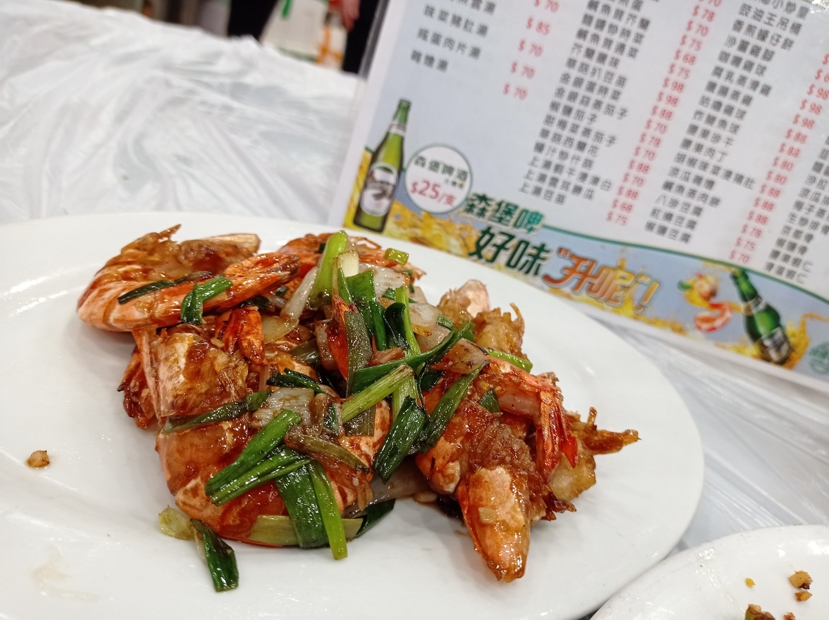 プリプリのエビをにんにくと炒めて最後に鼓油で味付けというシンプルな調理法なのだけれど、美味しのよね、これが。
